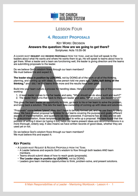 A Leader must request and receive proposals from the team. Just as God will speak to the leaders about what He wants and where He wants them to go, He will speak to teams about how to get there. When a leader and a team are functioning well, the leader is giving direction and the teams are submitting proposals to the leader.